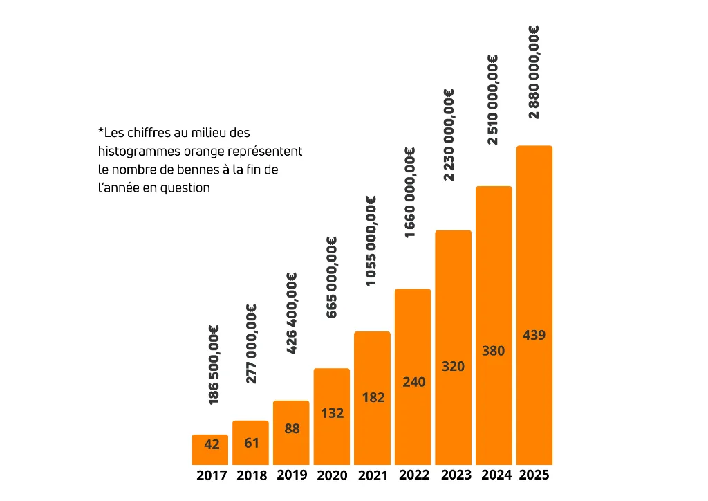👉 Plus vous mettez à disposition de contenants, plus votre chiffre d’affaires progresse.À titre d’exemple, voici la courbe de croissance du site pilote de Besançon, qui illustre concrètement le potentiel de développement d’une franchise Tridoo.
