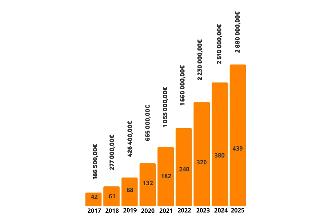 Le modèle Tridoo repose sur un métier récurrent, avec plus de 90 % du chiffre d’affaires reconduit chaque année. Cela garantit une évolution régulière et pérenne de l’activité.
